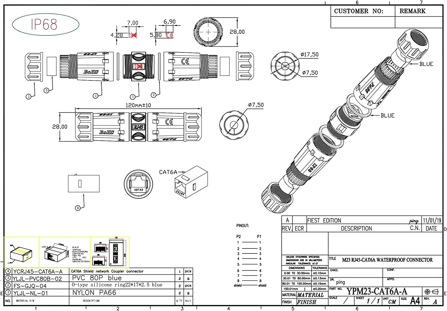 Design] Ip68 ethernet connector safeguards network components from wet and dirty conditions, ensuring a connection with both ends waterproofed.